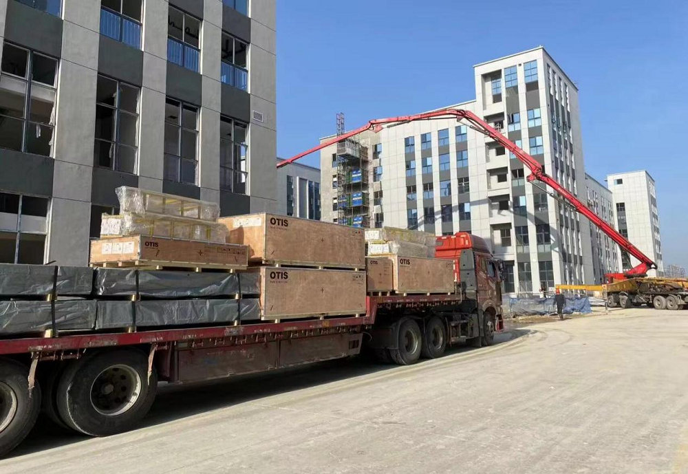長(cháng)淮衛鎮派出所項目電梯到貨,現場(chǎng)施工人員正在準備卸貨